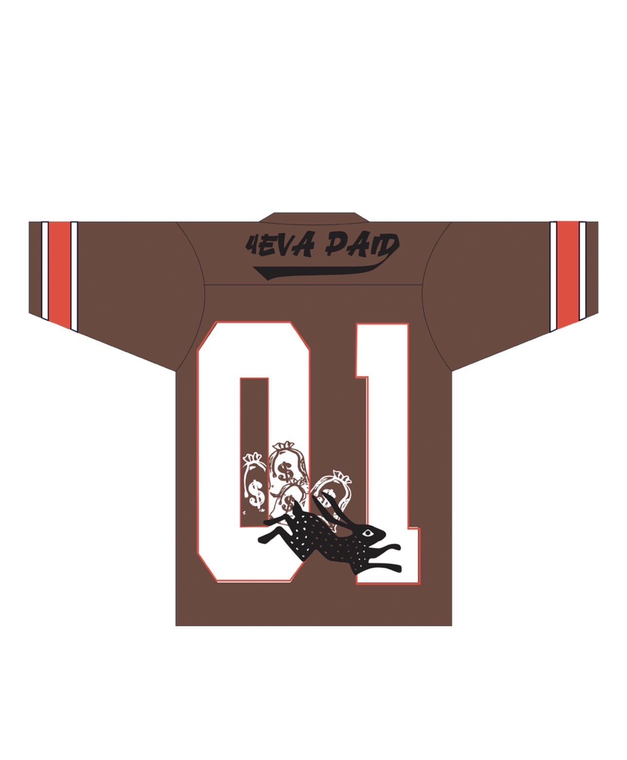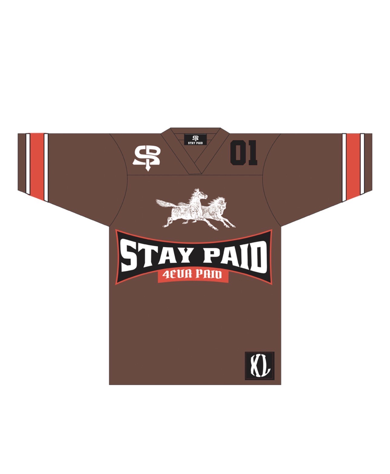An oversized, V-neck athletic jersey in a unique coffee-brown colorway. This vintage-inspired piece features collegiate-style sleeve striping, a central “STAY PAID” banner graphic with “4EVA PAID” detailing, and a striking white double-horse graphic that symbolizes speed and success.
