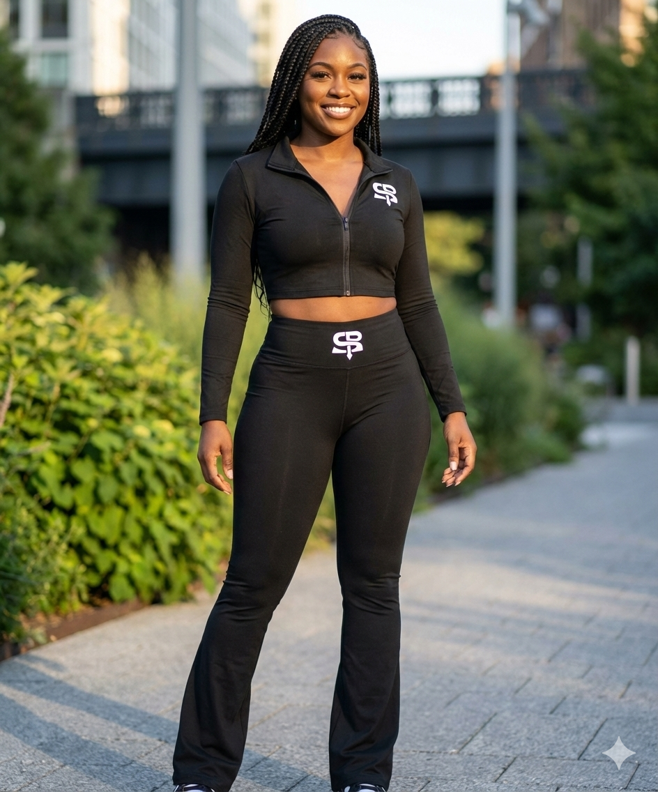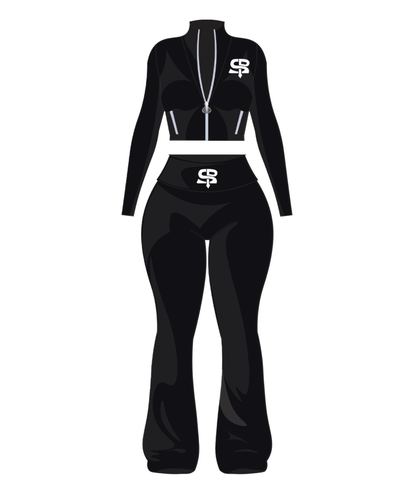 A sleek, form-fitting two-piece set designed for maximum style and versatility. This set features a cropped, long-sleeve zip-up jacket with a high-neck collar and matching high-waisted flared leggings that create a contoured, athletic silhouette. Finished with the signature white “SP” logo on the chest and waistband, the “Onyx” set is the perfect blend of performance-ready activewear and high-street fashion.